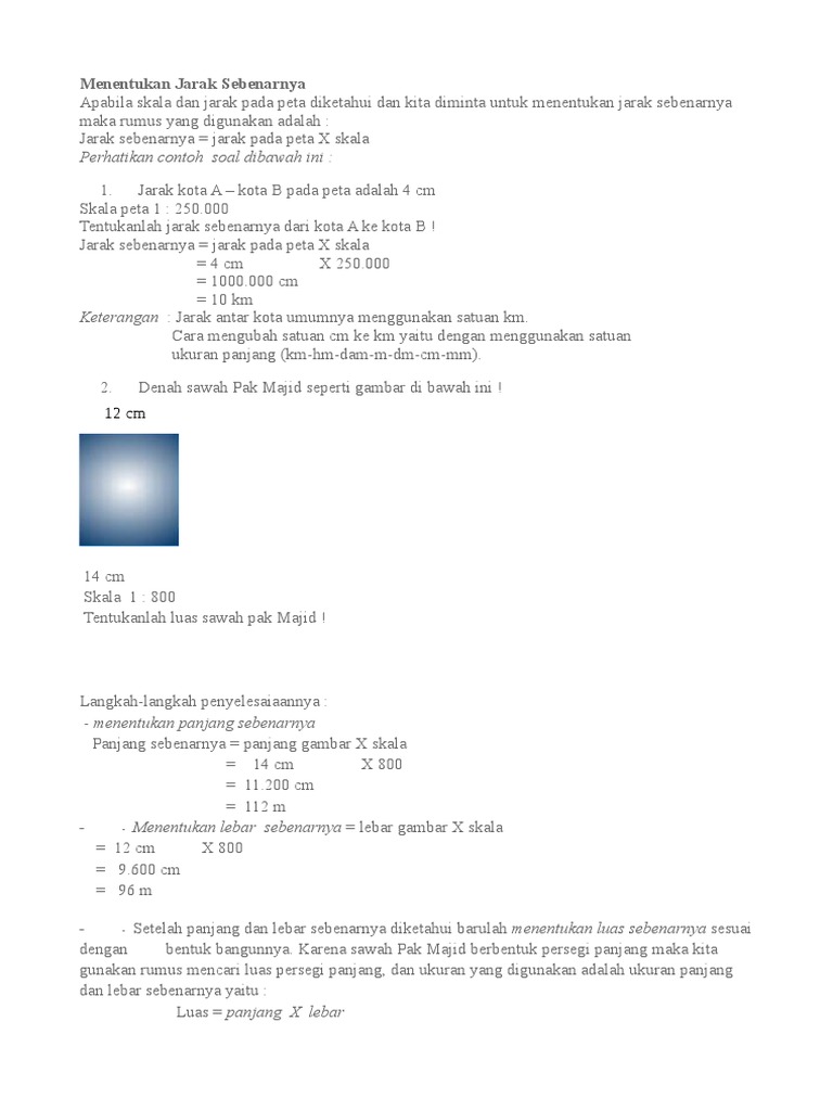 Setelah ketemu jarak sebenarnya dalam cm, selanjutnya tinggal konversi dari cm. 1000 yang artinya setiap 1 cm pada peta mewakili 1000 cm jarak yang sebenarnya. Angka itu dikenal sebagai skala.dikutip dari ilmu ukur tanah (1964), skala adalah perbandingan jarak di peta dengan jarak di bumi. Jarak peta = skala x jarak sebenarnya. Dengan menggunakan rumus di atas, maka kita dapatkan rumus jarak sebenarnya di peta geografi atau matematika sebagai berikut: