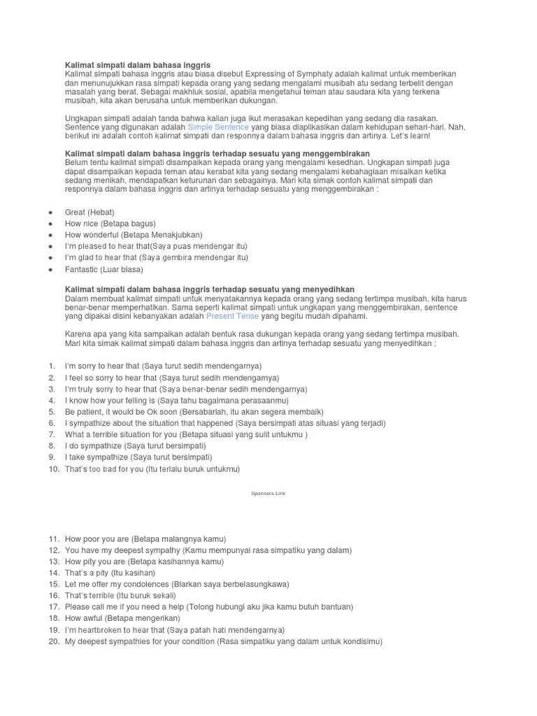 I am so sorry to hear that. Di bawah ini adalah beberapa ungkapan yang bisa digunakan untuk mengungkapkan simpati dan cara meresponnya. Expression of sympathy merupakan ungkapan yang dikatakan atau diucapkan saat kita mendengar kabar atau berita duka, buruk atau sedih. Selain itu, kalian bisa membaca contoh dialog yang menggunakan . Contoh dialog simpati dalam bahasa inggris · 1.